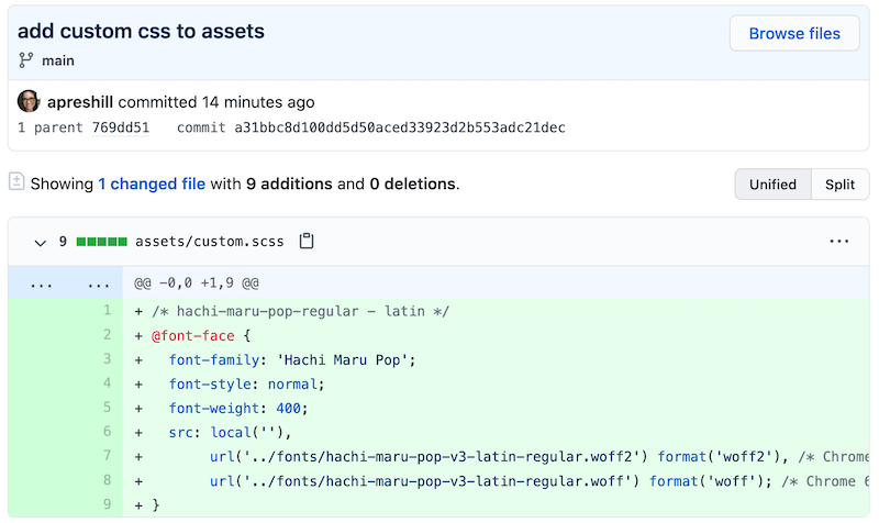 • Create a file named custom.scss in the new assets/ folder to define the @font-face CSS rule for each font/weight combination you downloaded. For example, here is a custom.scss that imports the Nanum Myeongjo font. The webfonts helper app will help write your CSS for you (using ../fonts/ to customize the folder prefix correctly by default), like this: